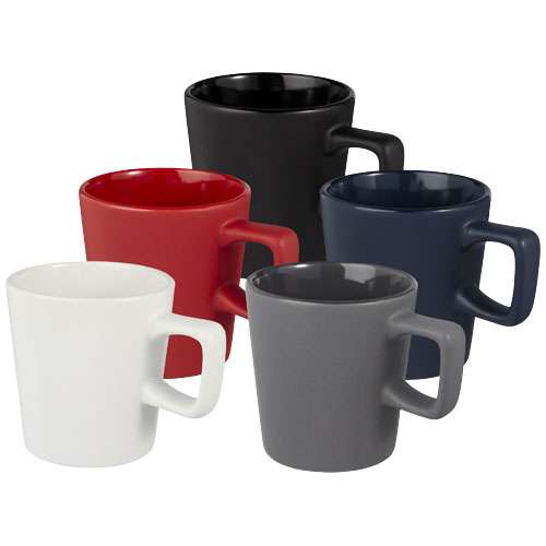 Tazza in ceramica dal design moderno con finitura opaca. Capacità di 280 ml. Sempre lavabile in lavastoviglie, indipendentemente dal metodo di personalizzazione impiegato. Fornita in una confezione regalo in cartone riciclato.