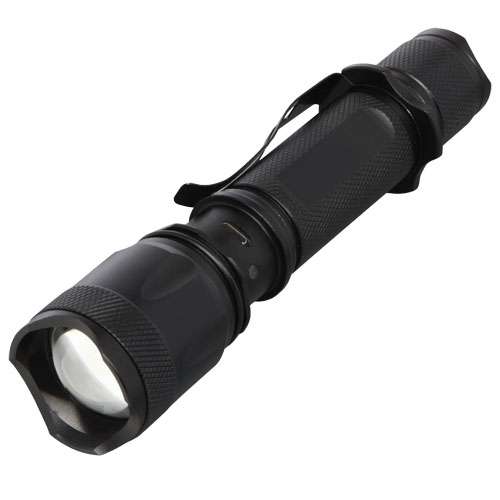 Questa torcia militare ricaricabile in alluminio ad alta potenza non si scarica praticamente mai. Il solido alloggiamento in lega di alluminio nero conferisce un look professionale e resistenza alle cadute da 1 metro di altezza. Grazie alla clip da cintura, la torcia è facilmente trasportabile ed è resistente agli spruzzi con un grado di protezione IPX4. La luce a LED da 5 W genera 300 lumen per massimo 3 ore, nonché un fascio luminoso di 200 metri con 5 diverse modalità di illuminazione: alta, media, bassa, intermittente e SOS. L'elevata potenza è data da una batteria al litio integrata, la cui capacità è di 2000 mAh. La torcia ha dimensioni pari a 14,5 x 3,4 cm e pesa solo 170 grammi. Viene fornita con un manuale di istruzioni ed è racchiusa in una confezione regalo in cartone riciclato di dimensioni pari a 17,5 x 6 x 4 cm. Si consiglia l'incisione laser sulla struttura in alluminio.