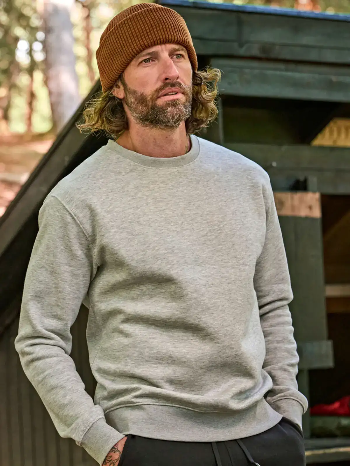 70% cotone ring-spun, 30% poliestere. Felpa unisex, cotone egiziano a fibra lunga, tessuto a tre fili trattato per una superficie più morbida, elastane in tutte le costine, felpata internamente e doppie cuciture.