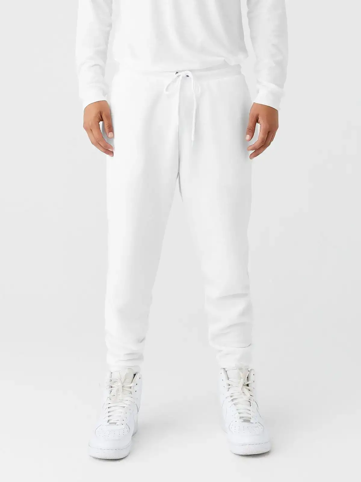 52% cotone Airlume pettinato e ring-spun, 48% pile di poliestere. Pantaloni felpati unisex, con cuciture e tasche laterali, polsini alla caviglia a costine, cintura elastica con occhiello e coulisse bianca. Etichetta removibile.