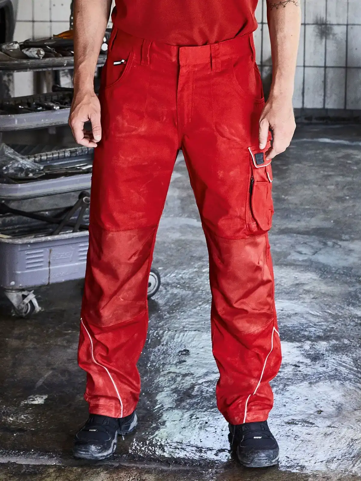 65% poliestere, 35% cotone, rifiniture 100% poliammide. Pantaloni da lavoro in tessuto misto resistente e robusto, girovita elastico con passanti per cintura, riforzo CORDURA sulle ginocchia, triple cuciture, tasche frontali, tasche porta attrezzi, due tasche con zip, taschino per cellulare, taschini porta-penna con rinforzo CORDURA, dettagli riflettenti (senza funzione protettiva / senza DPI) sulle tasche, sul davanti e sul retro, zip YKK, lavabile a 60° C e ideale per asciugatura in asciugatrice. Per evitare che il prodotto si rovini, tutti i bottoni e le zip sono nascosti.