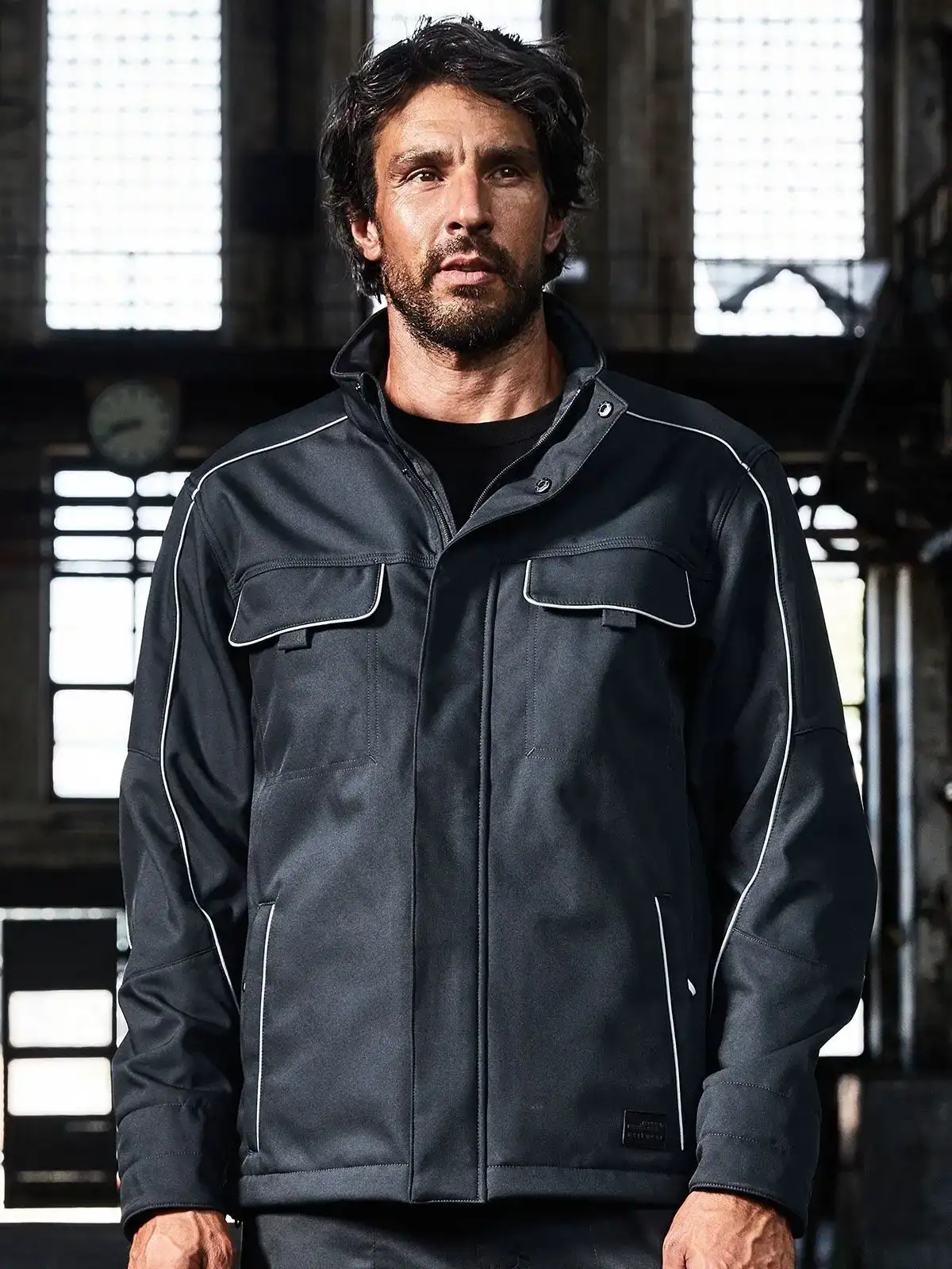 100% poliestere. Giacca in softshell robusta e resistente, interno in pile, antivento e idrorepellente (colonna d'acqua 2,000 mm), traspirante e permeabile al vapore (2,000g/m²/24h), collo alto, maniche ergonomiche, retro esteso, polsini interno manica, zip interna nascosta con protezione per il mento, tasche laterali con zip e tasche interne, tasche sul petto con cucitura su un solo lato per facilitare la decorazione, tasche interne, dettagli riflettenti (senza funzione protettiva / senza DPI) su tasche, spalle e sul retro, zip YKK. Per evitare che il prodotto si rovini, tutti i bottoni e le zip sono nascosti.