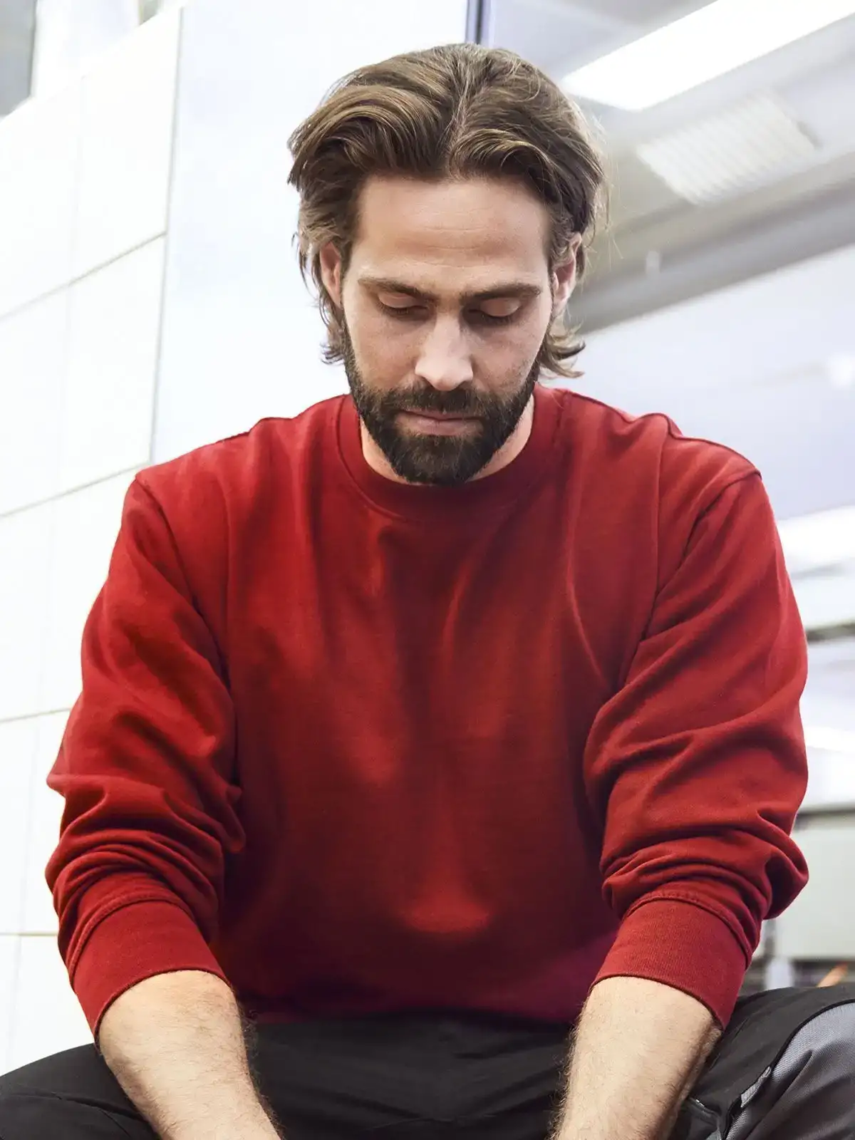 70% cotone, 30% poliestere. Felpa girocollo con maniche set-in, resistente e felpata. Girocollo, giromanica e girovita con bordini a costine elastiche, lavabile fino a 60°.