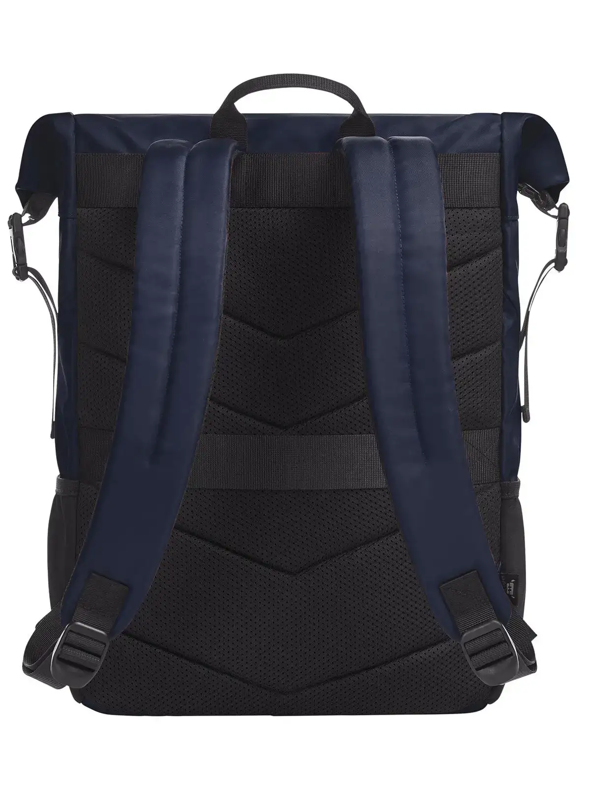 Polyamid 290d Twill. Zaino di alta qualità, scomparto principale con chiusura lampo e chiusure a fibbia laterali, ampia tasca anteriore con chiusura lampo accessibile lateralmente, tasche a rete laterali, possibilità di fissaggio con luce per bicicletta a LED, fascia passante sul lato frontale, ampia tasca a inserto imbottita, tasca a inserto piatta e passanti per penna interni, anello di fissaggio sul retro per aste di trolley, sistema di trasporto ben imbottito, manico