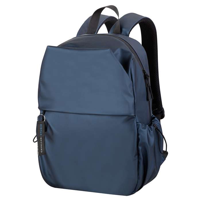 zaino in PU polywater ; materiale idrorepellente ; due tasche frontali con zip ; tasche laterali con chiusura coulisse ; tasca imbottita per portatile ; retro e spallacci imbottiti ; fascia per trolley sul retro ; pouch in cotone e borsa in tnt Cavallari Studio inclusi