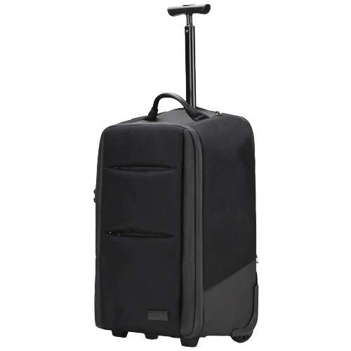 Zaino trolley per portatili convertibile (55 x 34 x 22 cm) in tessuto impermeabile 1680D realizzato in PET riciclato (equivalente a 31 bottiglie riciclate). Grazie alla struttura indeformabile e all'imbottitura inferiore, protegge perfettamente gli oggetti riposti al suo interno. Presenta uno scomparto imbottito per portatili o tablet, una maniglia in metallo e un power bank rimovibile per la sicurezza aeroportuale. È anche dotato di una tasca di sicurezza con protezione RFID e di un lucchetto per mantenere gli oggetti al sicuro. Da una tasca sul retro si estraggono gli spallacci che convertono il trolley in uno zaino. È inoltre dotato di un power bank a ricarica rapida da 10.000 mAh e di un cavo di ricarica luminoso in PET riciclato. Tramite il cavo, il power bank può essere caricato direttamente con il connettore USB/Android all'esterno dello zaino (senza la necessità di rimuoverlo). La personalizzazione può essere effettuata sul pannello anteriore e su un lato del cavo 3 in 1 in PET riciclato. Fornito con una custodia.